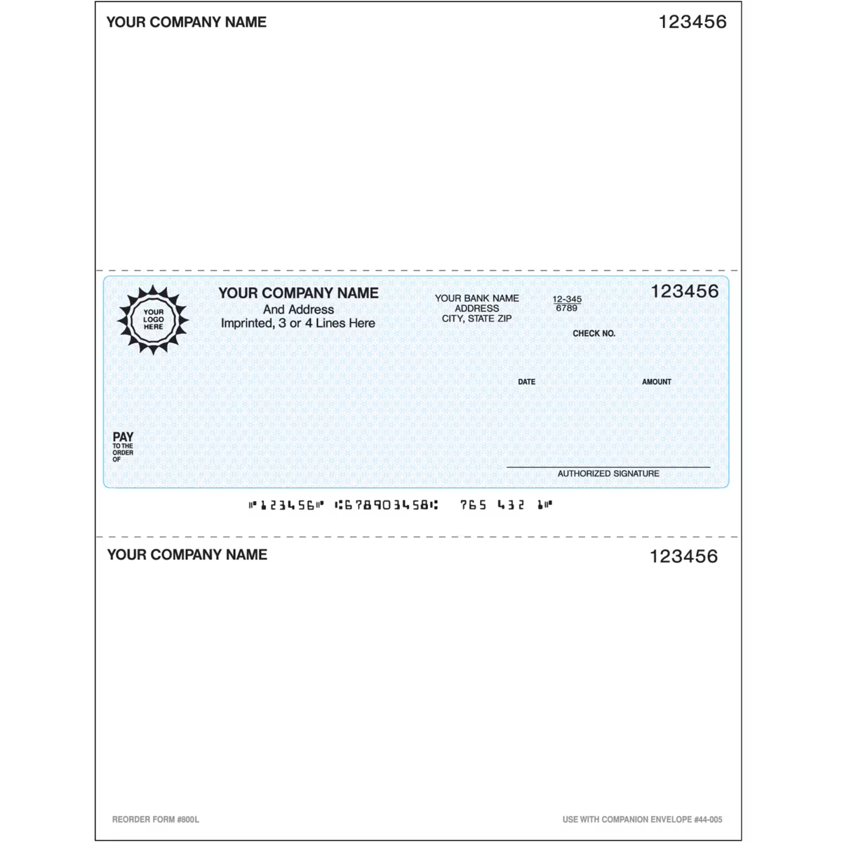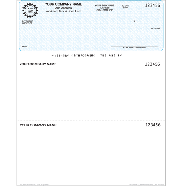 052L Multipurpose Check on Top SKU: 052L $2.80 Select options Back $2.80 REPEAT, NEW, OR REPEAT WITH CHANGES ? : Repeat New Repeat With Changes Prior Job# Reverse Numbering : No Yes Check Start Number Number of Signature Lines : NONE 1 2 3 Special Instructions COLOR: Company Information Line 1 Company Information Line 2 Company Information Line 3 Address Line 1 Address Line 2 City State Zip Phone Fax Email Bank Name Bank Address Bank Address 2 Routing Number Account Number Imprint Below Signature Line Title Above Signature Line Text on Check Stub SELECT LOGO COLOR : Black Reflex Blue Process Blue Teal (PMS 320) Green (PMS 348) Green (PMS 347) Brown (PMS 464) Maroon (PMS 201) Burgundy (PMS 208) Warm Red Red (PMS 185) Orange (PMS 151) Gray (PMS 423) Custom Color Logo & Options : $0 - Color Logo $68 - Black Logo $90 - Color Logo No Charge - 1 Color Logo No Charge - Black Logo EZ-Shield : No Yes Quantity -+ Please select options before adding to cart Add to Cart Add to Cart